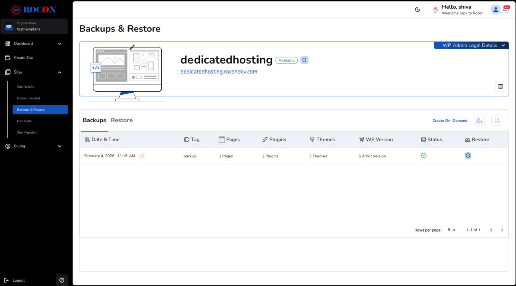 The Backups & Restore provides you view of the backups available for your sites. Here’s what you can expect from this tab: