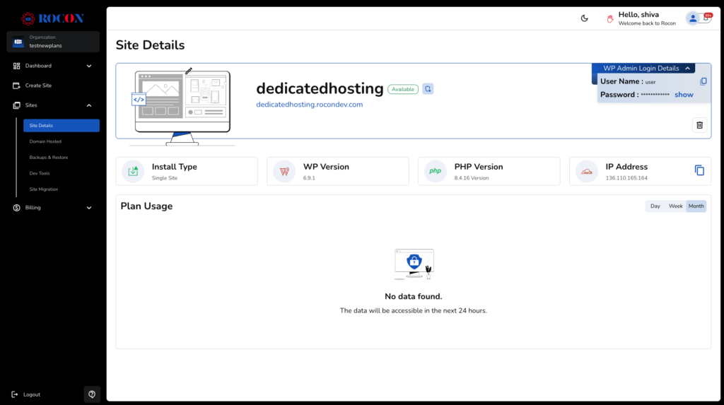The SiteDetails tab offers a comprehensive overview of your WordPress site, including essential information about its setup, configuration, and associated actions. Use this tab to keep track of your site’s details and conveniently manage it within the ROCON platform.